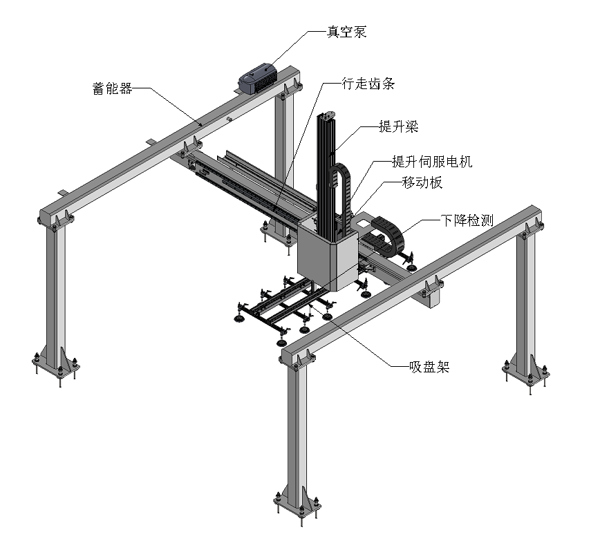1,結(jié)構(gòu)框架,主要由立柱等結(jié)構(gòu)件組成,其作用是將各軸架空至一定高度,多由鋁型材或方管,矩形管,圓管等焊接件構(gòu)成;